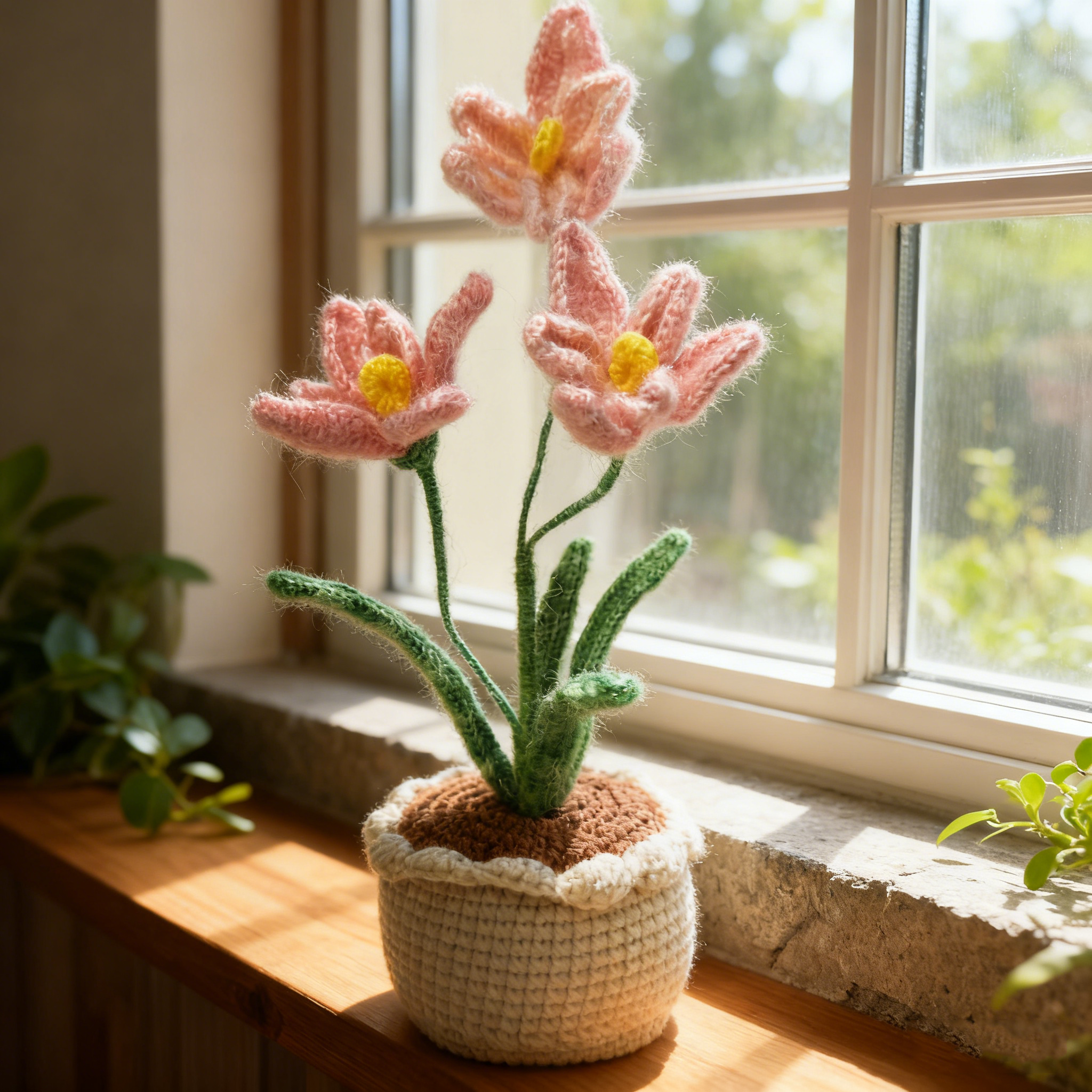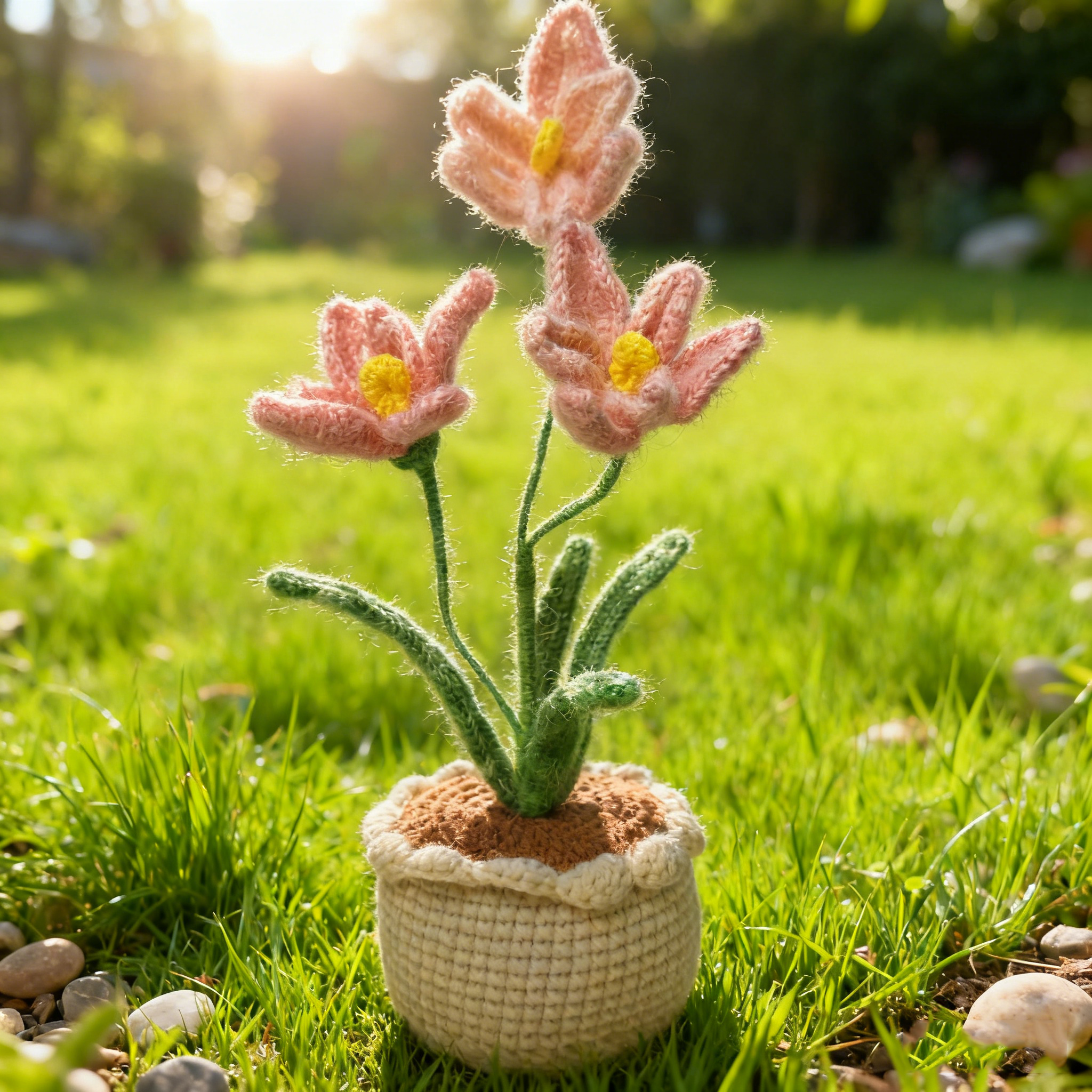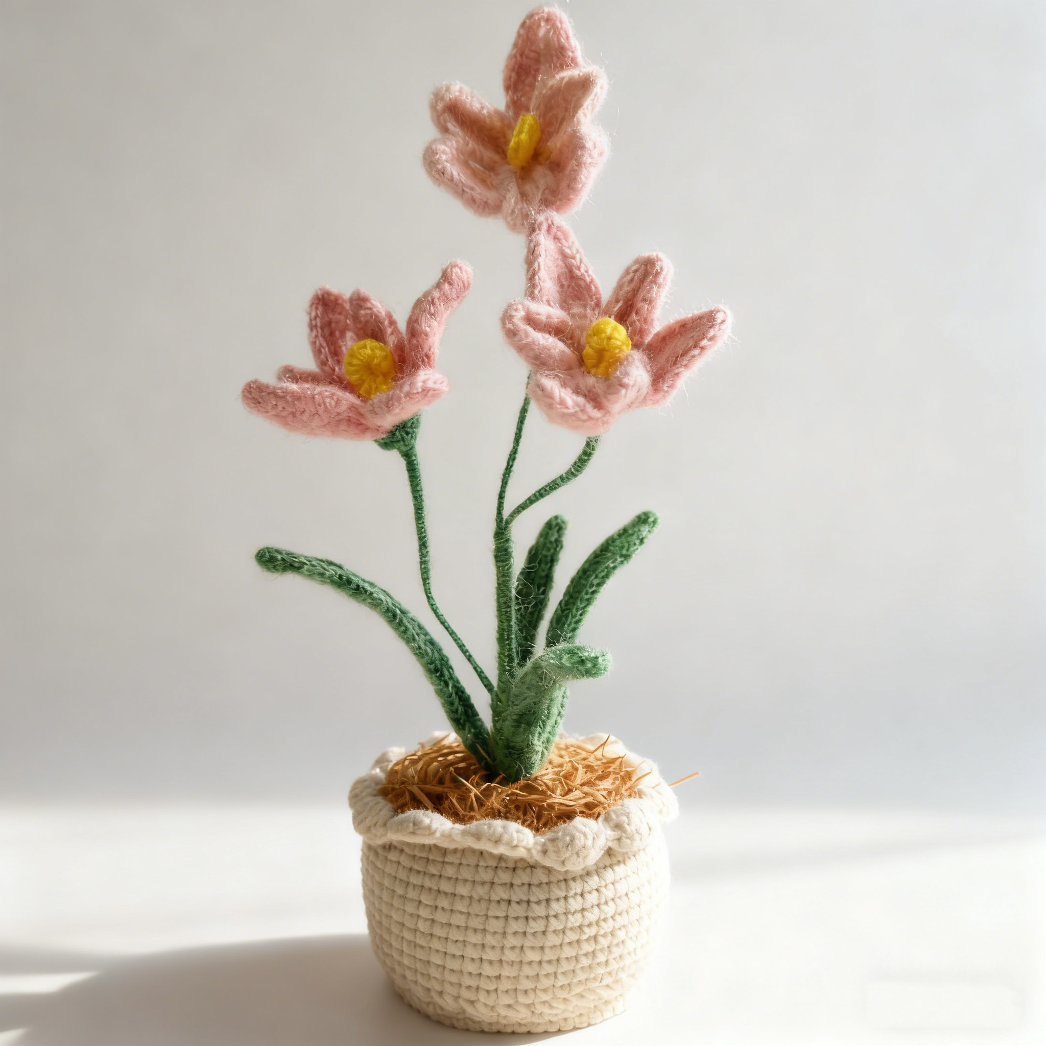 Crafted from fluffy, gentle yarn, this piece features three delicate tulips (in dreamy purple and blush-pink hues, each finished with a sunny yellow center) and textured green crocheted stems. They’re nestled in a cozy beige crocheted planter (topped with warm brown “soil” and a ruffled edge for extra charm).