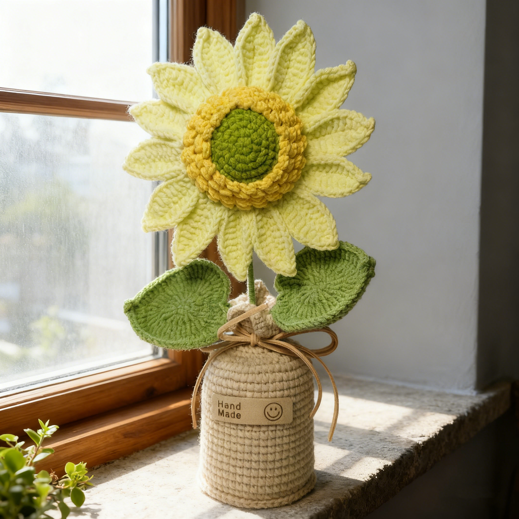 Crafted from soft, textured yarn, this piece features a full, lifelike sunflower (with gradient yellow petals and a vivid green center) paired with two lush crocheted leaves, all tucked into a cozy woven crochet vase. Adorned with a “Hand Made” tag and a delicate ribbon tie, it’s the perfect blend of whimsy and warmth.