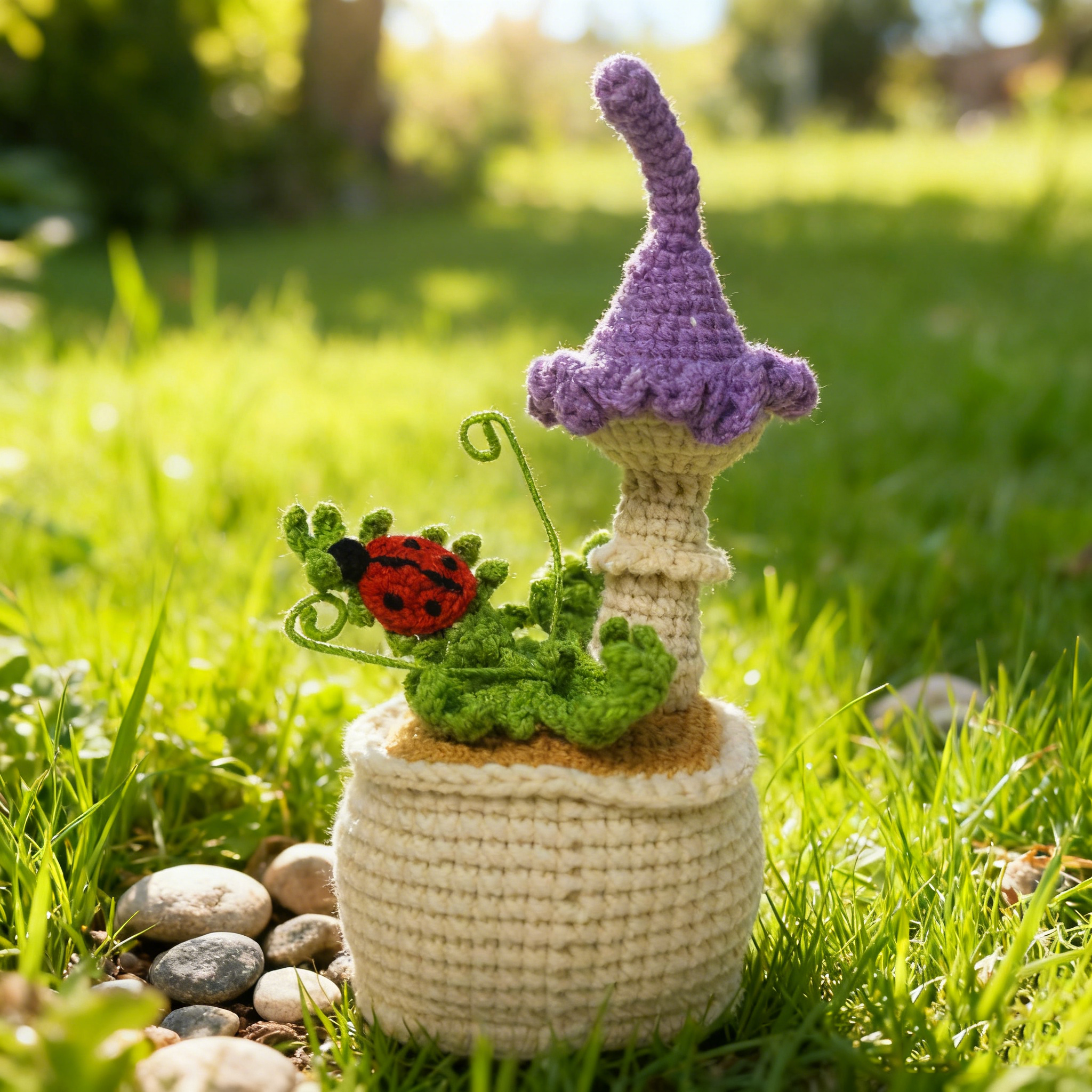 Crafted from soft, cozy yarn, this piece features a playful purple-capped mushroom (with a curly stem), a tiny red-and-black ladybug, and lush green crocheted foliage—all nestled in a textured beige “planter” (topped with a warm, earthy brown “soil” detail). Every stitch brings whimsy and warmth, making it a delightful, low-maintenance accent.